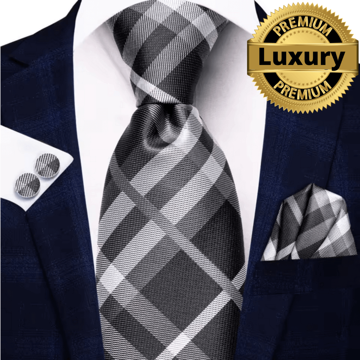 SOBRE GRAVATA DE SEDA XADREZ PRETA EXECUTIVA + LENÇO + ABOTOADURAS